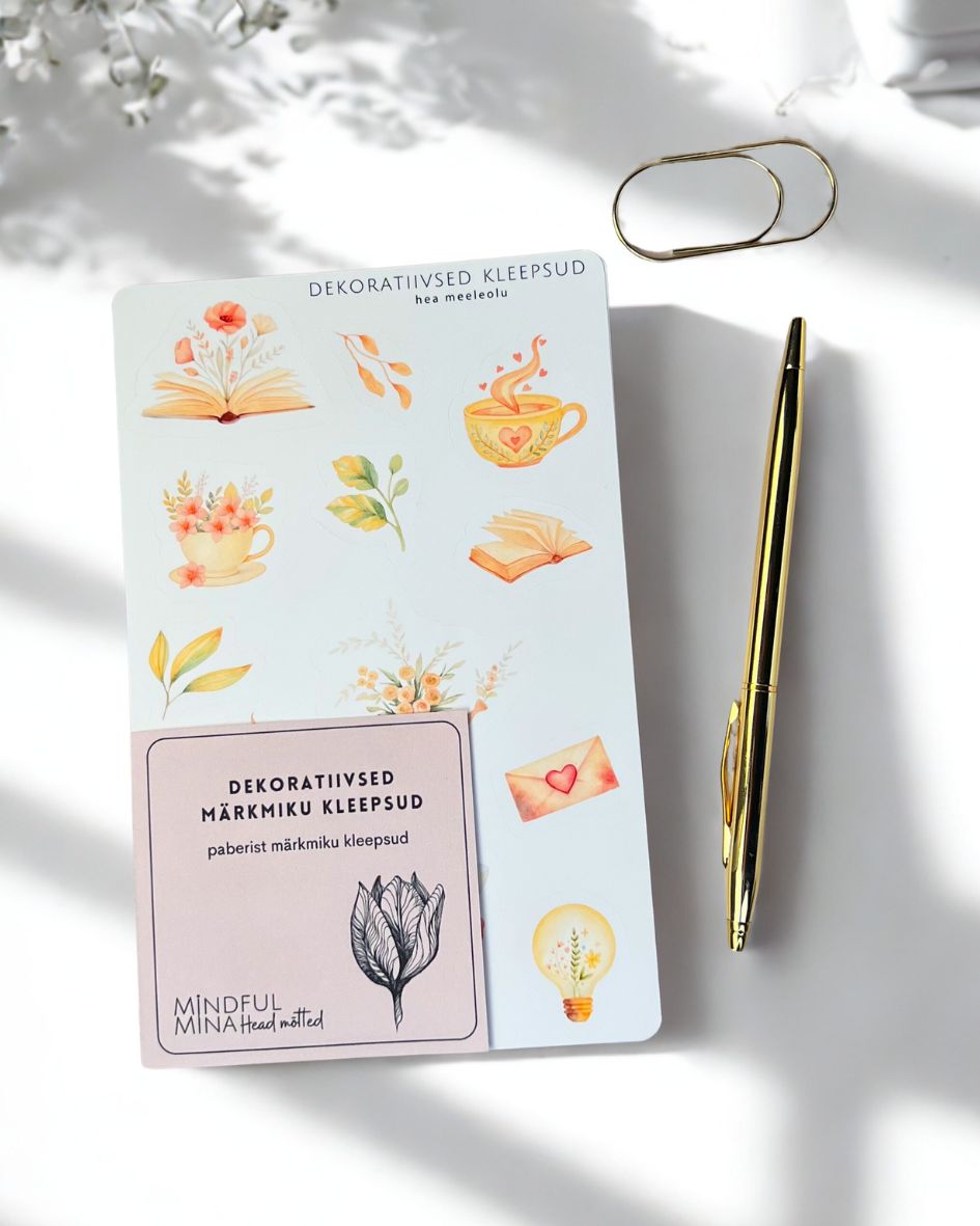 See kahe lehega dekoratiivsete kleepsude komplekt ühendab pastelsed õied, rahuliku meeleolu sümbolid ja õrna akvarellstiilis illustratsiooni, et tuua sinu märkmetesse rohkem inspiratsiooni ja loovust.