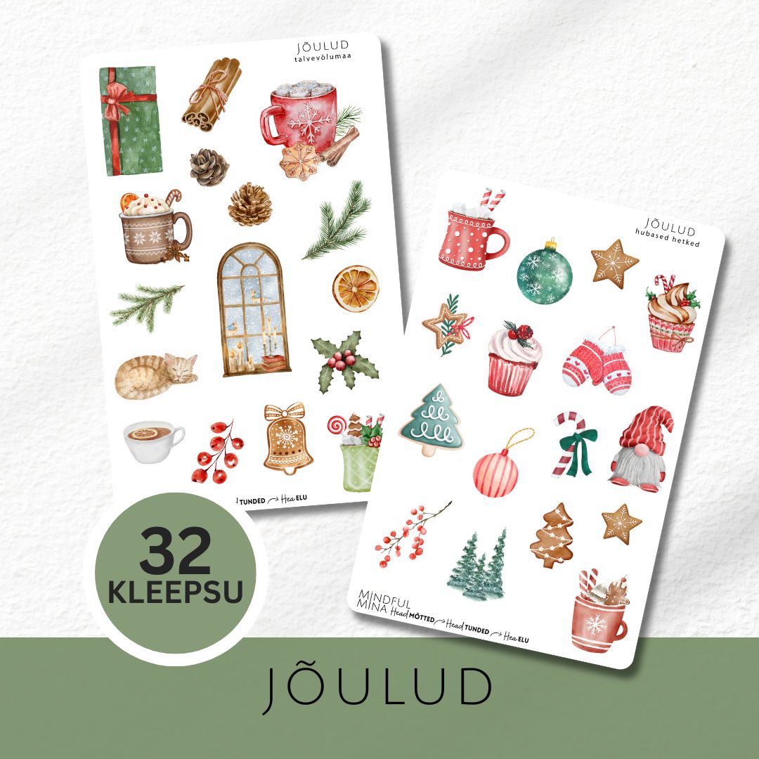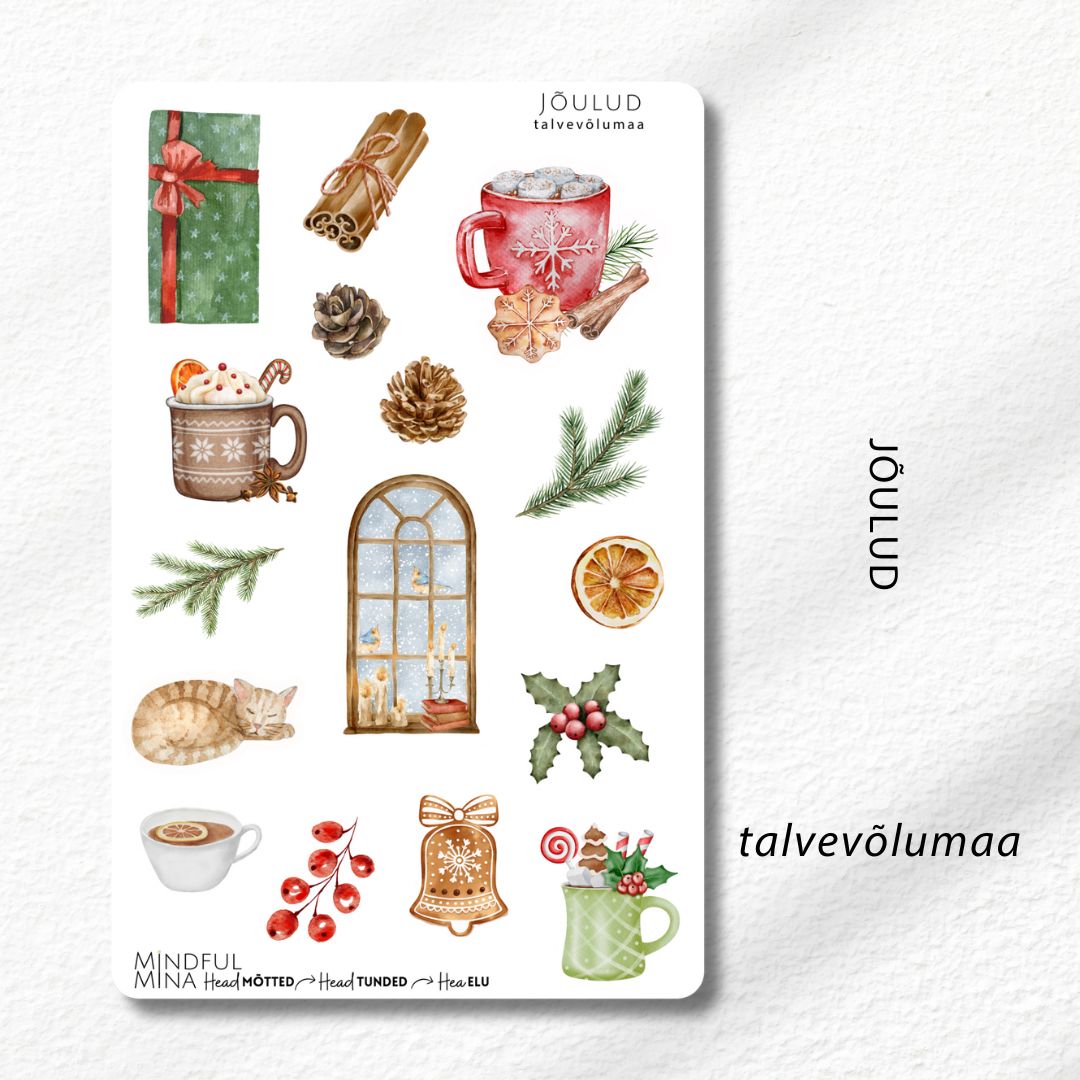 Kleepsudel on akvarellstiilis illustratsioonid, mis loovad sooja, koduse ja talviselt maagilise tunde. Tassike kuuma kakaod, kuuseoksad, küpsised, kingipakid, põhjapõdrad, lumised puud, jõuluehted ja muud armsad detailid muudavad iga lehe mini-kunstiteoseks.