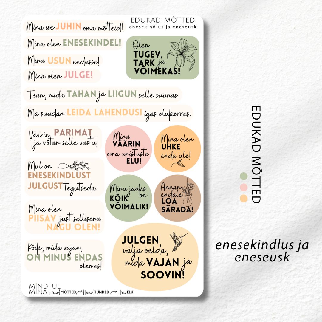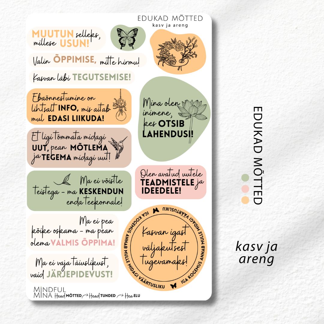 Kleebised on jagatud teemade kaupa: kasv ja areng, tegutsemine, järjepidevus, positiivne sisekõne, eneseusk.